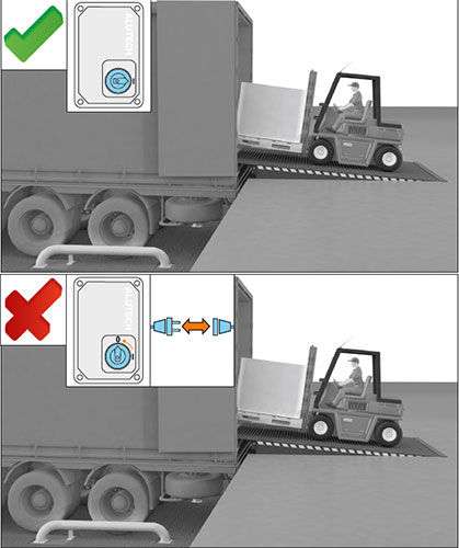 Проведение погрузочно-разгрузочных работ при отключенном питаниикатегорически запрещено. Отключение питания приводит к блокировке гидравлической системы, в результате чего платформа не подстраивается под перепады высоты кузова транспортного средства при проезде погрузчика. Весовые нагрузки при отключенном питании могут стать причиной поломки оборудования.