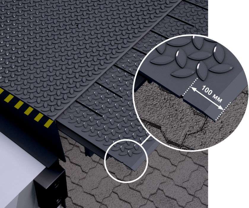Для безопасного движения по уравнительной платформе аппарель должна заходить в кузов транспортного средства на 80-100 мм и опираться на него по всей своей ширине.