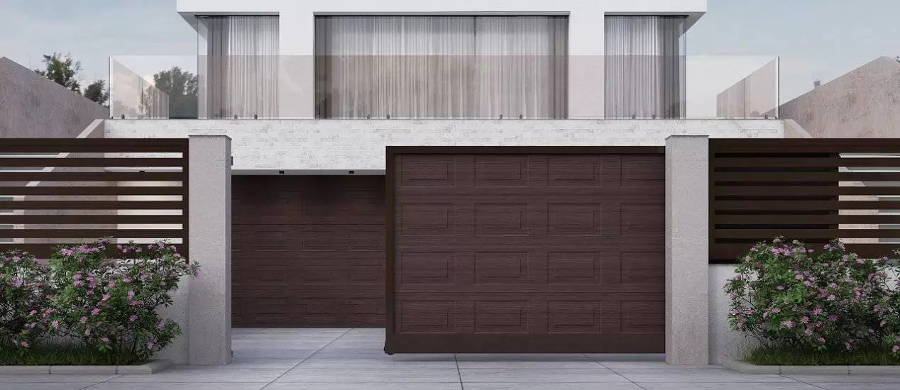 Неповторимый вид воротам придает комбинированное заполнение, которое позволяет сочетать между собой сэндвич-панели, алюминиевый и роллетный профили в различных вариациях.